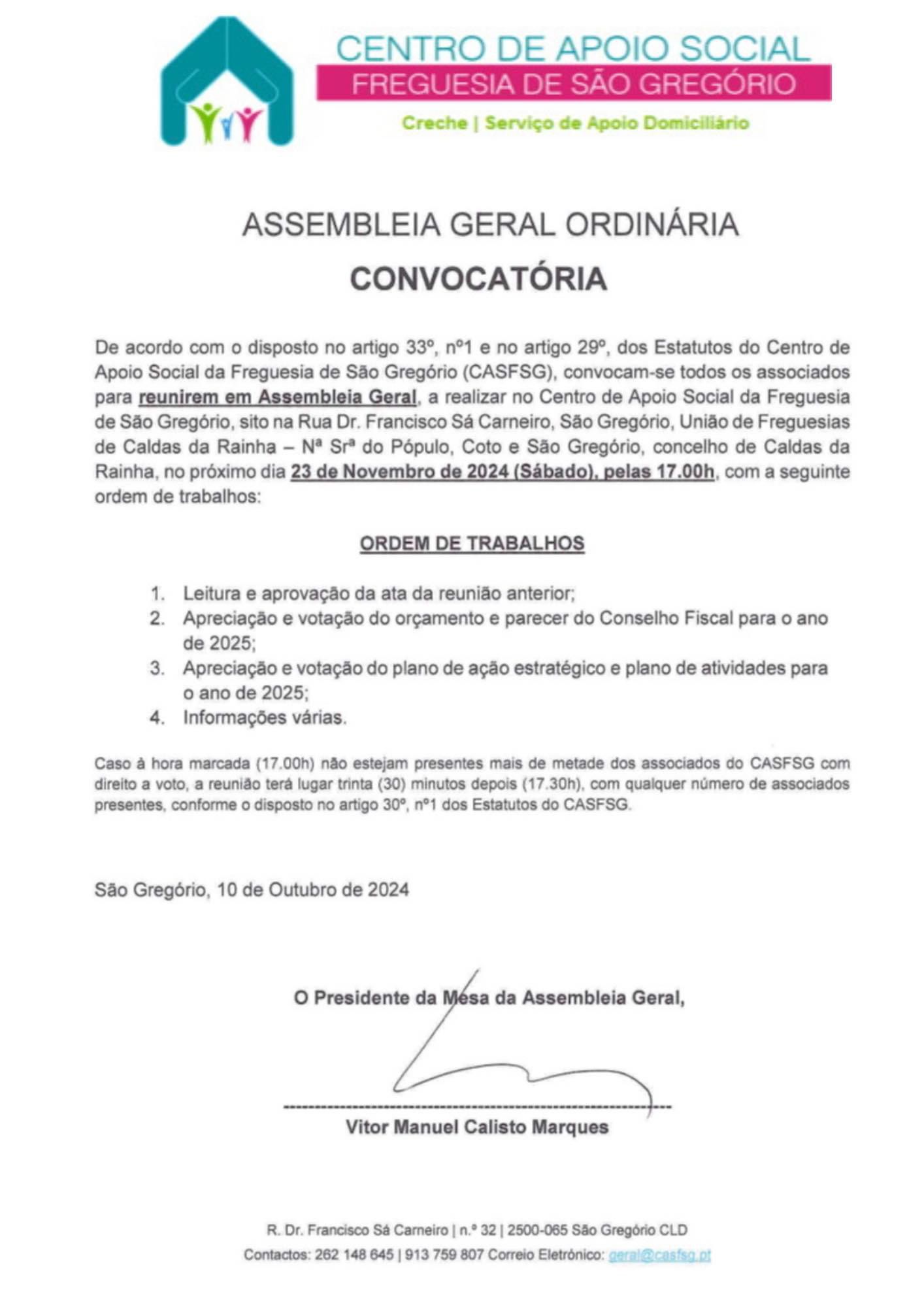 De acordo com o disposto no artigo 33°, n°1 e no artigo 29°, dos Estatutos do Centro de Apoio Social da Freguesia de São Gregório (CASFSG), convocam-se todos os associados do CASFSG para reunirem em Assembleia Geral, a realizar no Centro de Apoio Social da Freguesia de São Gregório, sito na Rua Dr. Francisco Sa Carneiro, São Gregório, União de Freguesias de Caldas da Rainha - Nª Srª do Pópulo, Coto e São Gregório, concelho de Caldas da Rainha, no próximo dia 23 de Novembro de 2024 (Sábado), pelas 17h00, com a seguinte ordem de trabalhos: